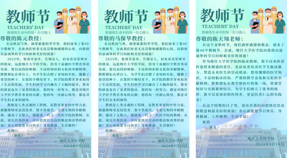 此外,医学院在广大学生中发起了“感恩吾师,医路同行”系列活动,通过录制短视频,在LED宣传屏展示教师们的风采、制作手工贺卡、发送祝福短信等这种质朴、温情的方式,为老师们送去最真挚的祝福,进一步营造了尊师重教的良好氛围。