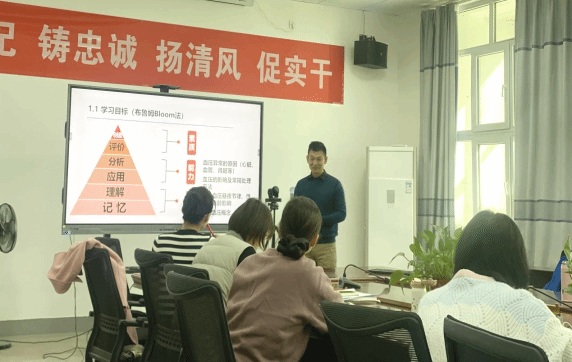 徐明锋老师从青年教师遇到的常见个四个问题: “教学目标不明确”、“重点内容难把握”、“教学反馈不及时”、“课程思政不会融”入手,结合对专业-课程-课堂三者关系的解读以及对“以学生为中心”教学理念的理解,逐一分析了四个问题产生的原因,解决问题的原则,并结合自己的教学实践举例说明了解决上述问题的方式方法。同时结合我院现有师资队伍的特点,推荐给青年教师教学借鉴的一些基本原则及方法,如布鲁姆教学目标分类法、Boppps结构教学设计、思政素材学生偏好调查问卷等。青年教师们积极提问,进行了深入的交流和探讨。