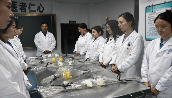 讲话与发言结束后,全体人员肃立,向可敬的大体老师默哀,低头静思,寄托深切哀思。默哀毕,师生们怀着虔诚与崇敬之心,依次向大体老师深深鞠躬、敬献鲜花,用最质朴庄重的仪式,表达对遗体捐献者的缅怀与敬意,一朵朵鲜花承载着追思与感恩,致敬这份跨越生死的无私奉献。