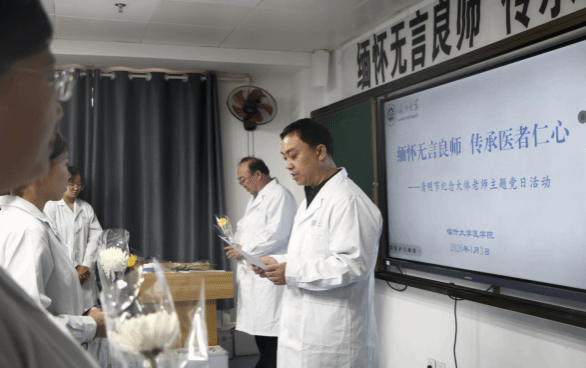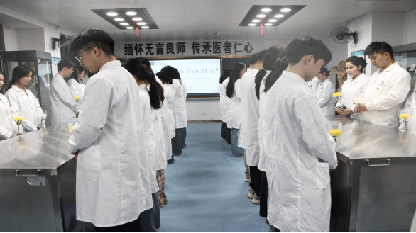 清明时节寄哀思,致敬无言育良医。为深切缅怀遗体捐献者的无私奉献,厚植医学人文精神,强化医学生敬畏生命、感恩奉献的职业素养,2026年4月3日,医学院党总支在医学院实验楼,隆重开展“缅怀无言良师 传承医者仁心”清明节缅怀大体老师主题党日活动。学院领导、全体师生党员及入党积极分子身着白大褂,以庄重肃穆的仪式,致敬每一位用生命照亮医学之路的“无言良师”,传承医者仁心,践行使命担当。