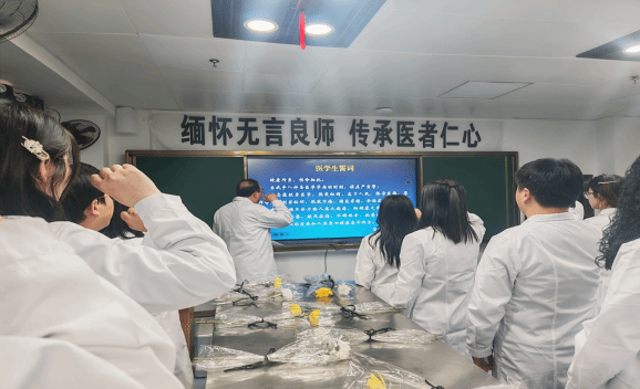活动最后,在俞胜清副院长的带领下,全体师生高举右拳,庄严重温医学生誓词。“健康所系,性命相托……为祖国医药卫生事业的发展和人类身心健康奋斗终身”,铿锵有力的誓言在实验室久久回荡,彰显着全体师生坚守医者仁心、践行使命担当的坚定信念,也让“敬畏生命、感恩奉献”的精神深植于心。